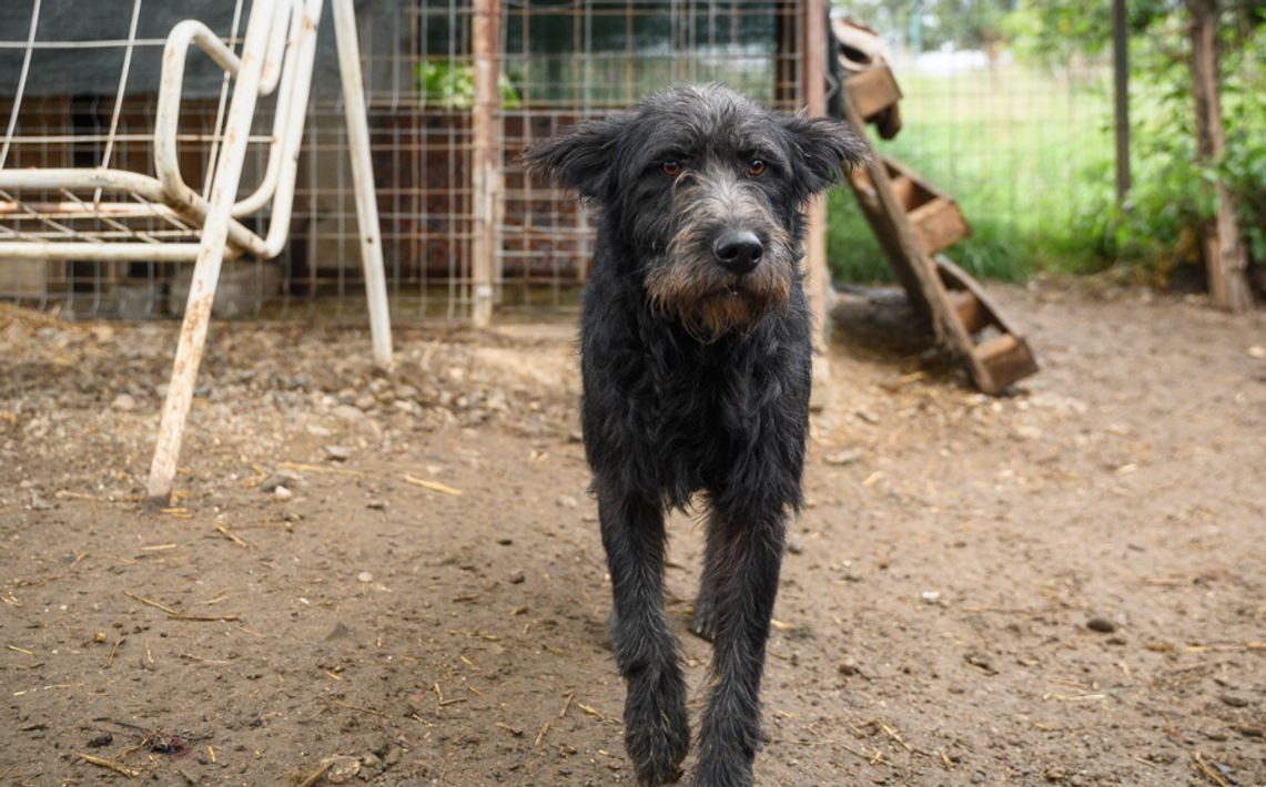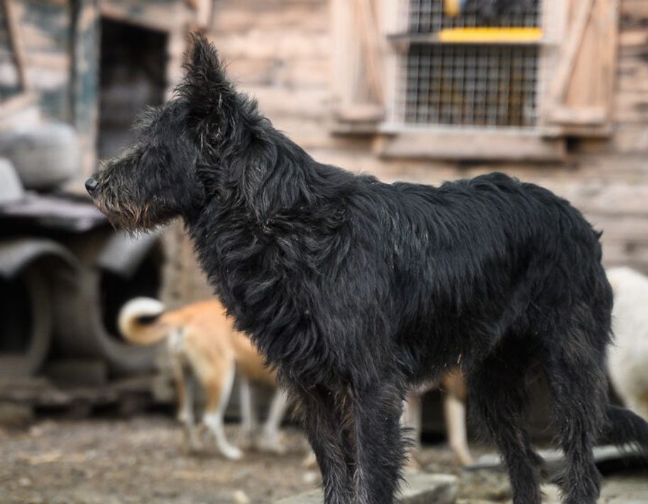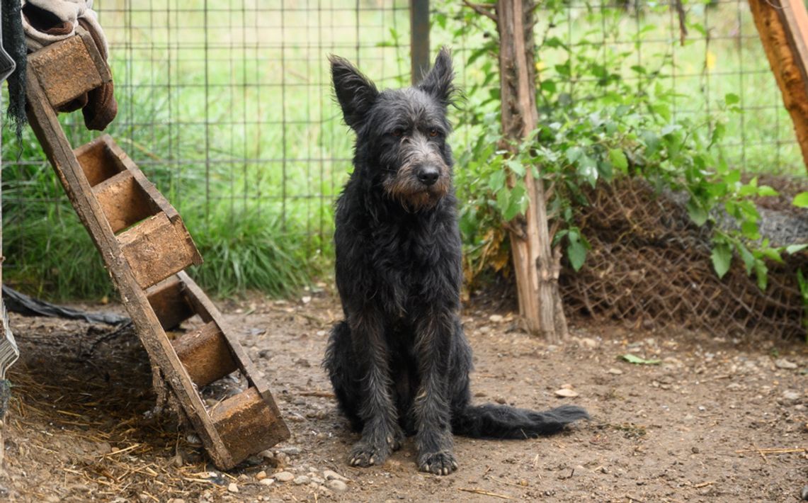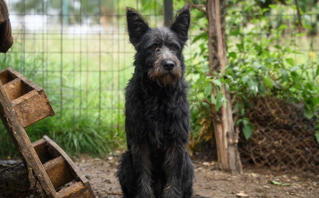 Mischling Houdini wiegt ca. 22 kg und misst etwa 55 cm Schulterhöhe. Mit seinem dunklen Fell, der charmant fransigen Schnauze und den aufmerksamen Stehohren ist er ein toller Hingucker.