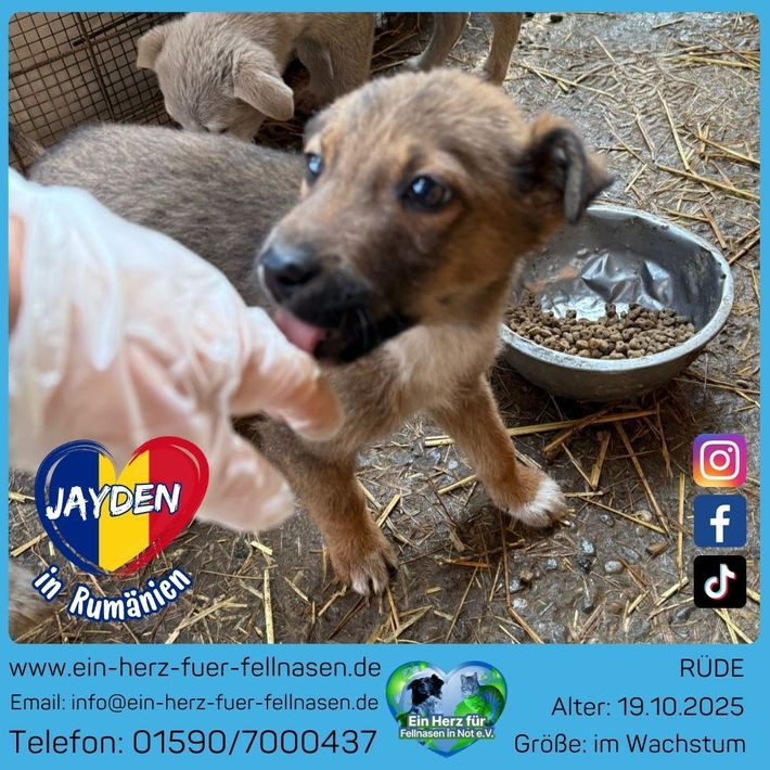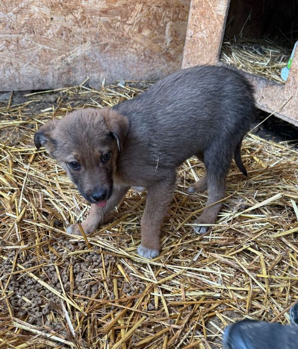 Ich bin Jayden, ein kleiner Welpe mit schokobraunem Fell und süßen weißen Pfötchen, die beim Herumtapsen schon ein bisschen verraten, wie viel Entdeckerfreude in mir steckt. 🥰