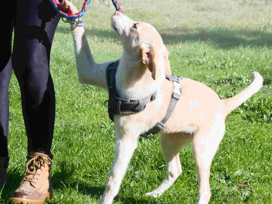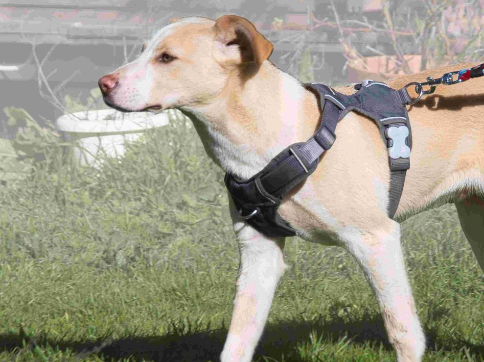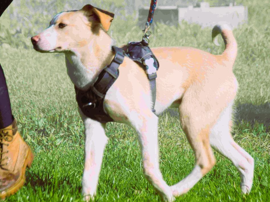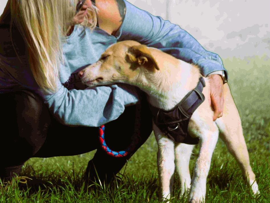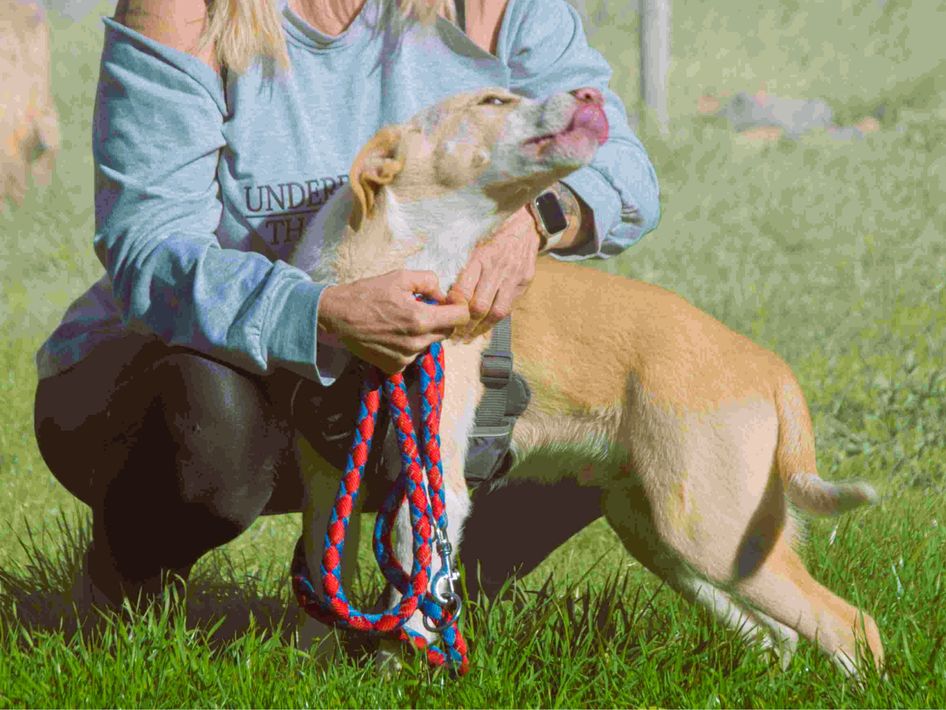 Freundlicher Junghund (07/2025, ca. 45 cm), verschmust und unkompliziert. Verträglich mit Hunden & Katzen. Stubenrein, autoerfahren. Sucht Zuhause.