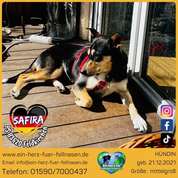 Safira ist verspielt, liegt aber auch gerne mal auf der Couch. Sie verträgt sich mit anderen Hunden und Katzen. Kinderlieb ist sie auch. Aktuell lebt sie in 83620 Feldkirchen Westerham.