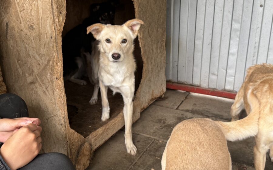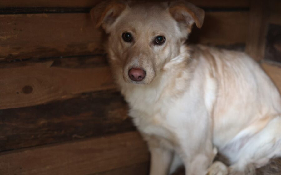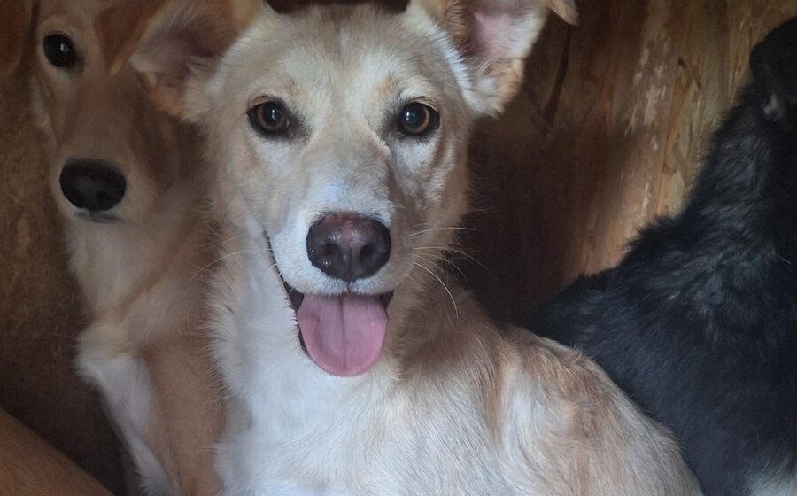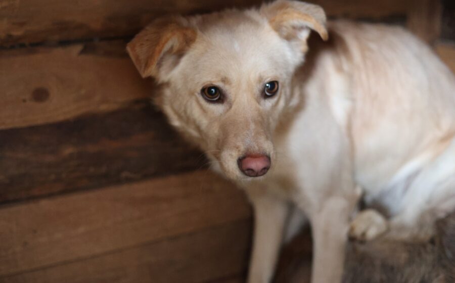Dürfen wir vorstellen? Das ist Tofu – eine wunderschöne junge Hündin mit hellem, weichem Fell, einem bezaubernden braunen Näschen und einem unglaublich wachen Blick