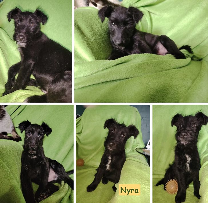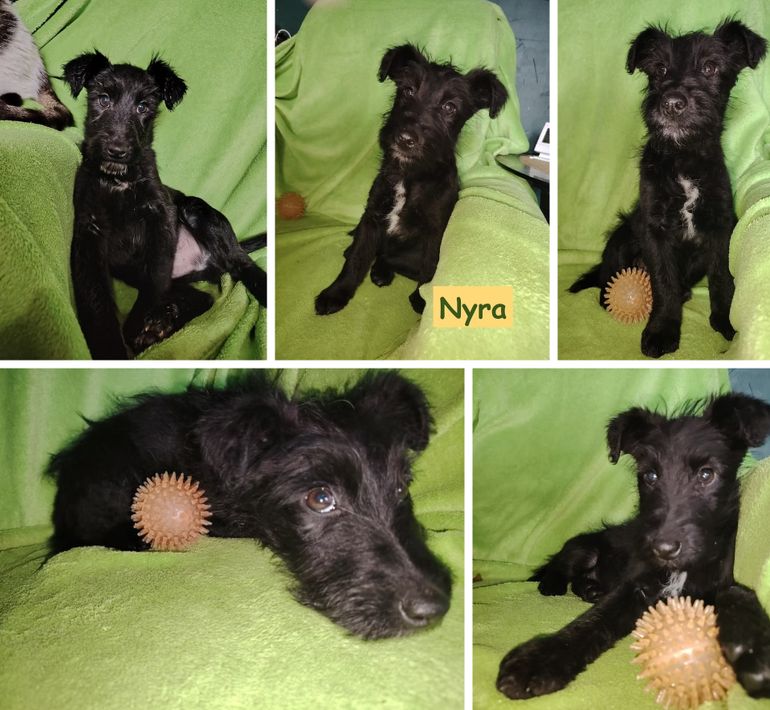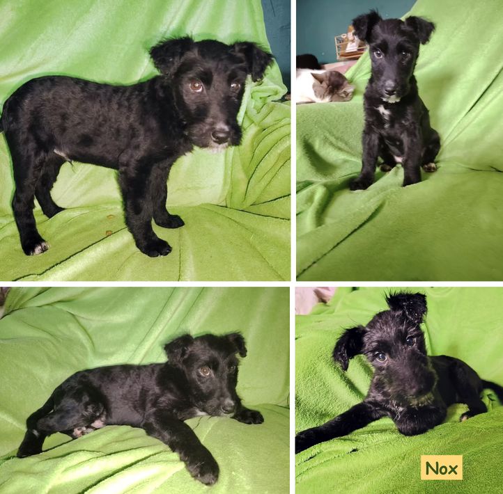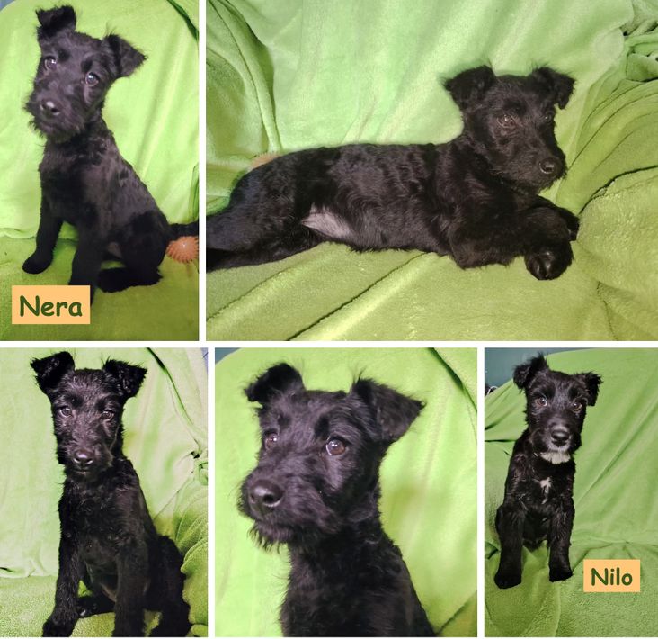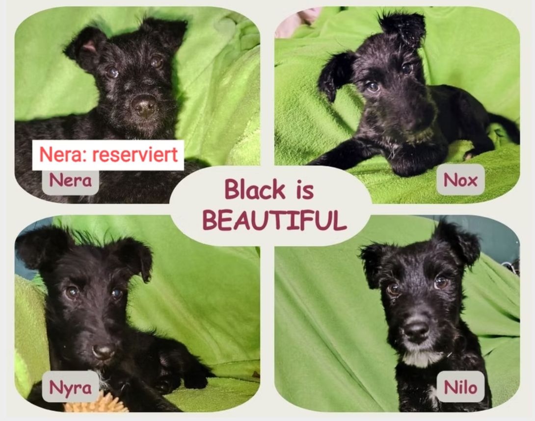 wir sind die Mädels Nera, Nyra und die Jungs Nox und Nilo – vier kleine schwarze Welpen mit glänzendem Fell, tapsigen Pfoten und Herzen voller Neugier.