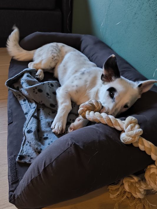 Ich bin anhänglich und freundlich zu meinem Menschen und genieße Streicheleinheiten und Kuscheleinheiten sehr. Spielen liebe ich