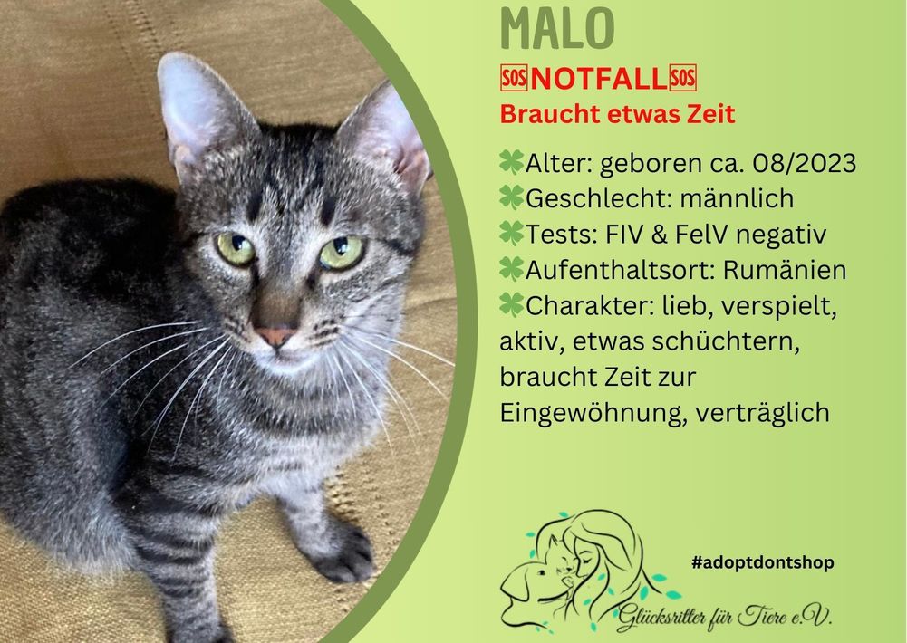 Malo wartet schon so lange darauf, dass ihn jemand sieht und ihm ein Zuhause schenkt. Er ist lieber Kater, der ein bisschen schüchtern ist. Hier ein Video von Malo❤️: https://youtu.be/bD2XoB5T3n0